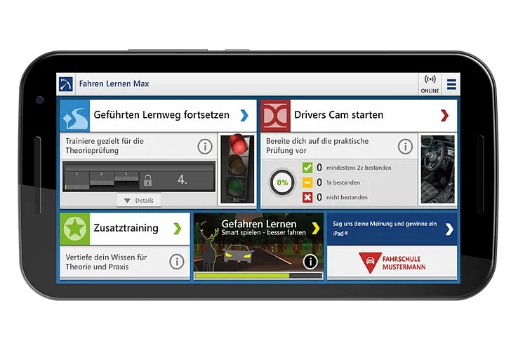 Mit dem Online-Führerscheintraining „Fahren Lernen Max“ kannst Du lernen, wann und wo Du willst: Zuhause am Rechner oder unterwegs auf dem Smartphone. Dabei passt sich „Fahren Lernen Max“ Deinen Lernfortschritten an. Und unterstützt Dich außerdem mit zahlreichen Lernhilfen. So macht lernen Spaß – und Du kommst schnell und sicher ans Ziel.